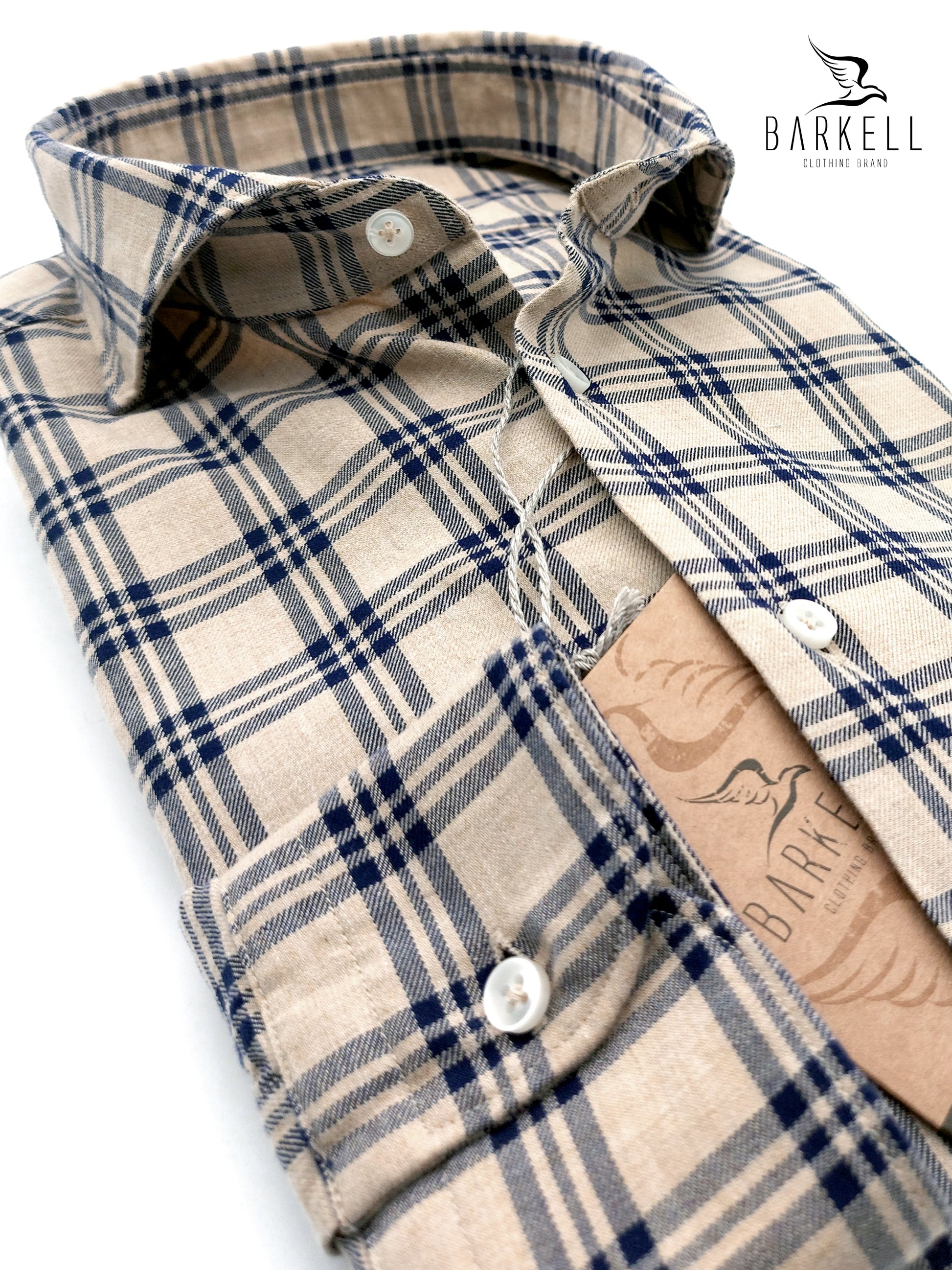 Camicia in Cotone Flanellato Quadro Blu Fondo Sabbia Collo Francese Cutaway