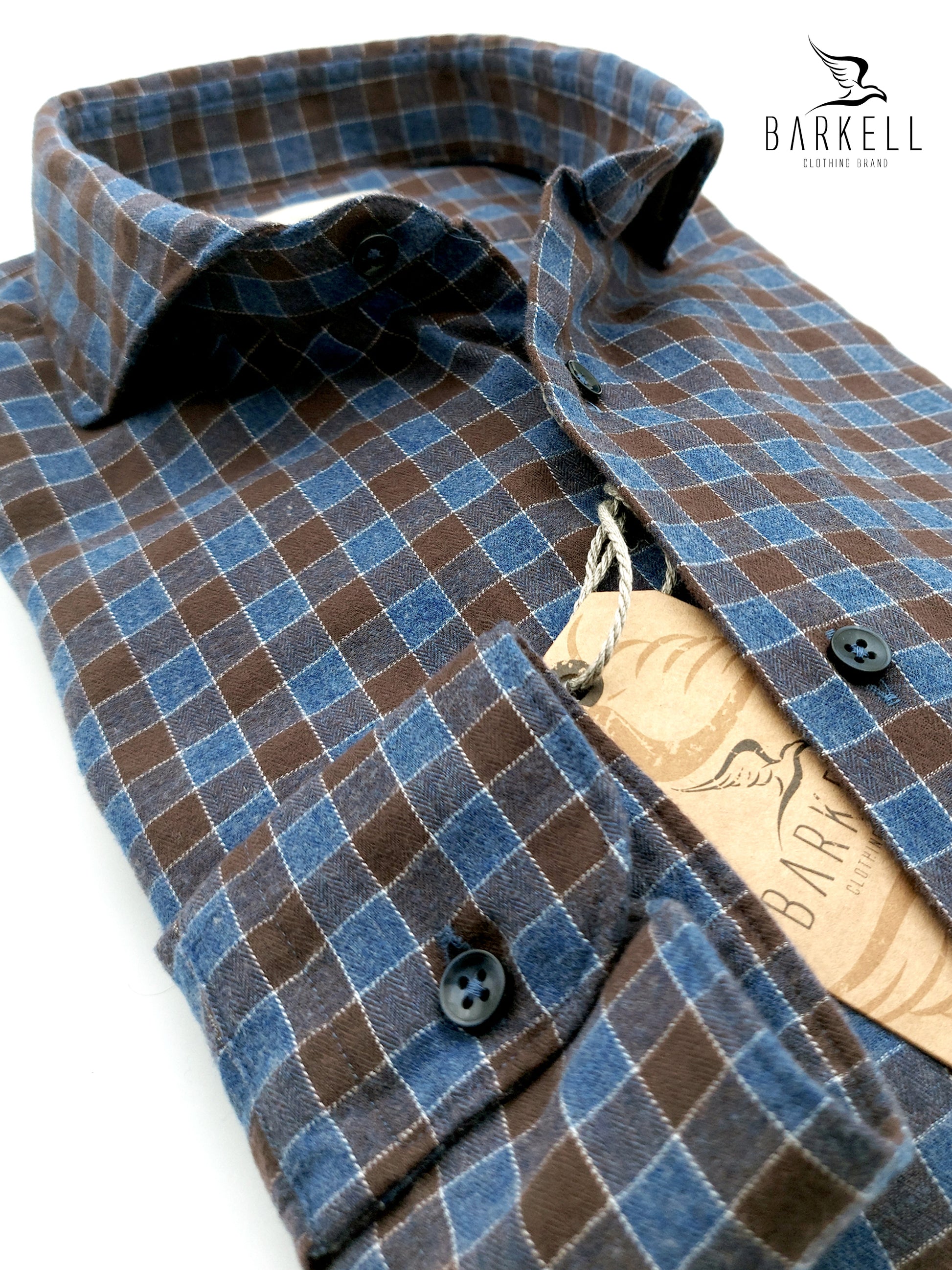 Camicia in Cotone Flanellato Quadro Marrone e Blu Denim Collo Francese Cutaway