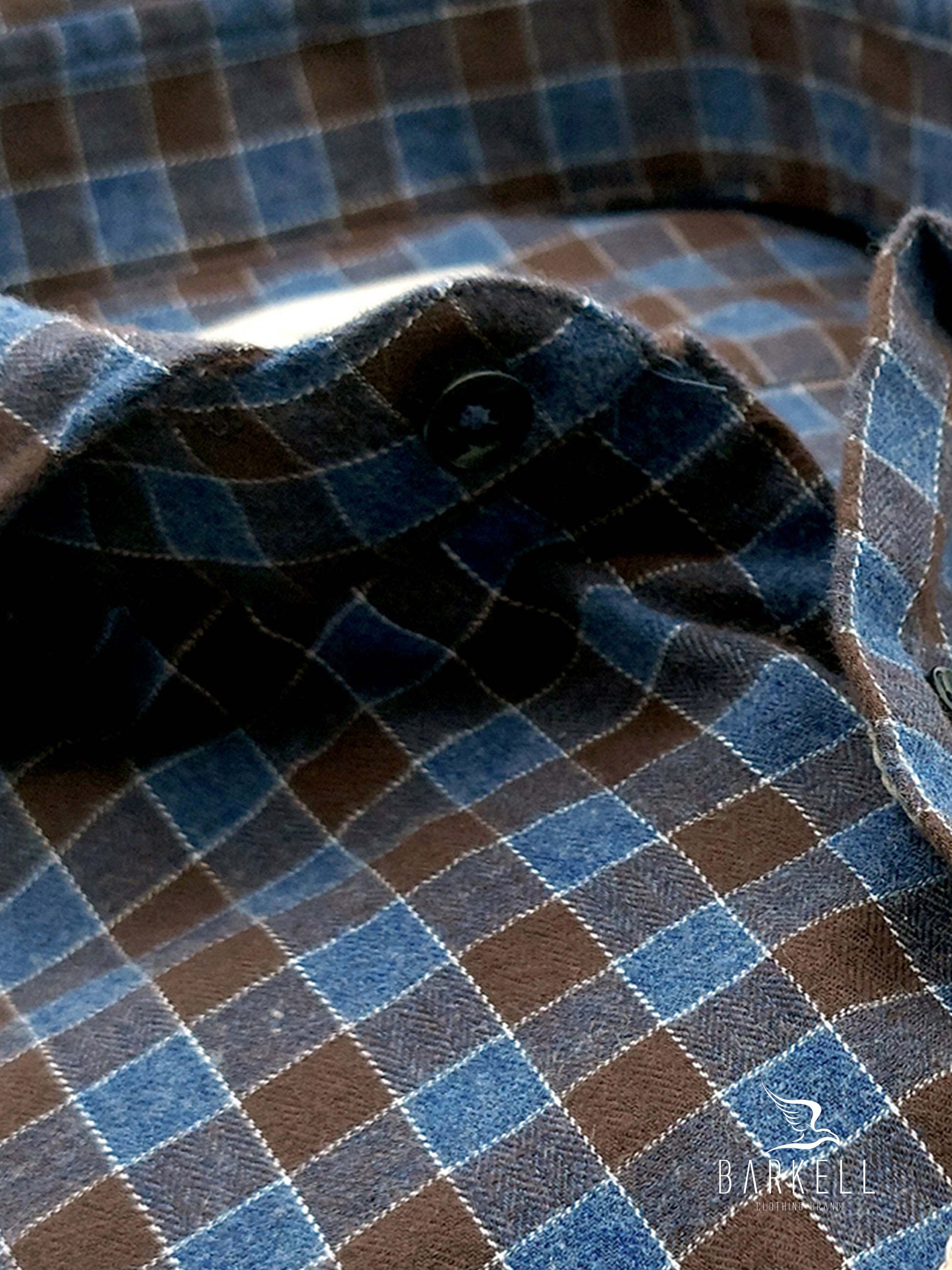 Camicia a Quadri Marrone e Blu Denim realizzata in Tessuto Flanellato 100% Cotone e Lavata in Capo per darle un piacevole effetto naturalmente vissuto.