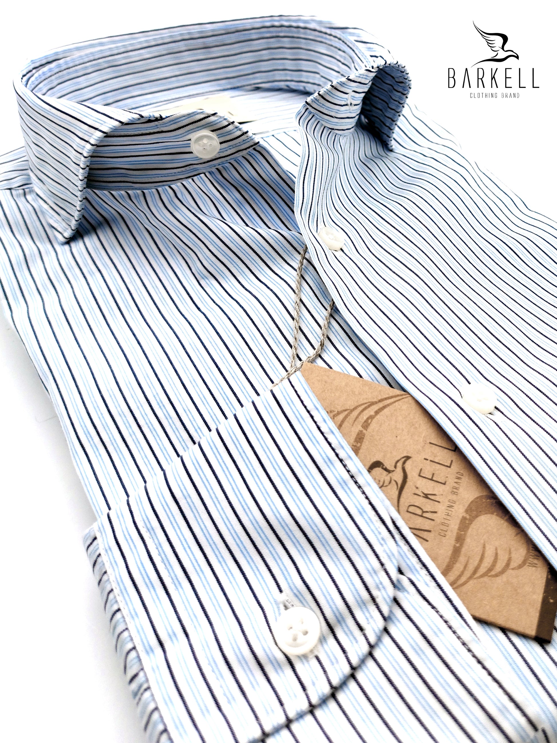 Camicia in Cotone Rigata Blu e Celeste Collo Francese Cutaway