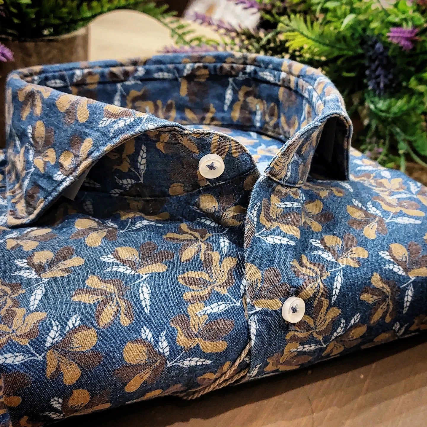 Camicia Fantasia Fiorata Coloniale su Fondo Stone Denim Chiaro realizzata in Tessuto Jeans 100% Cotone e Lavata in Capo per darle un piacevole effetto naturalmente vissuto.