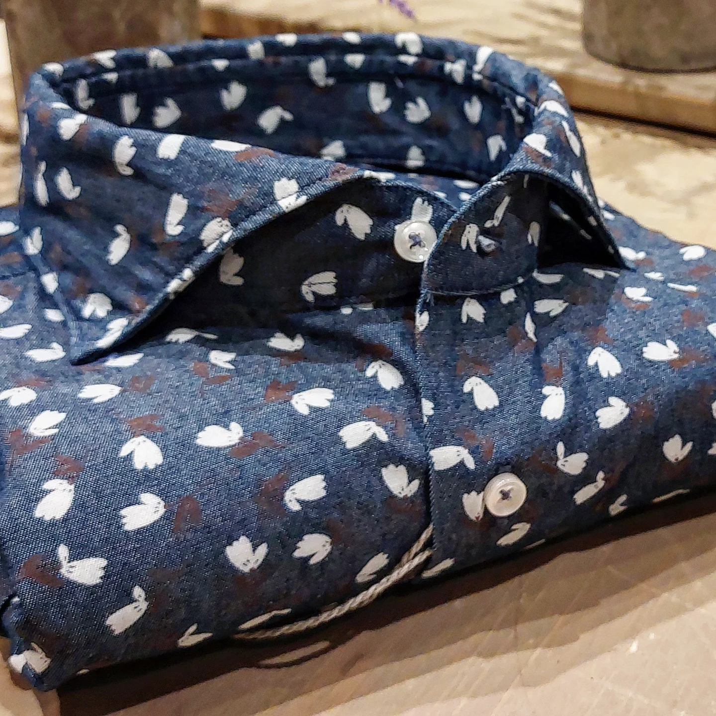 Camicia in Jeans Fantasia Fiore Gesso e Marrone Fondo Stone Denim Medio Collo Francese Cutaway