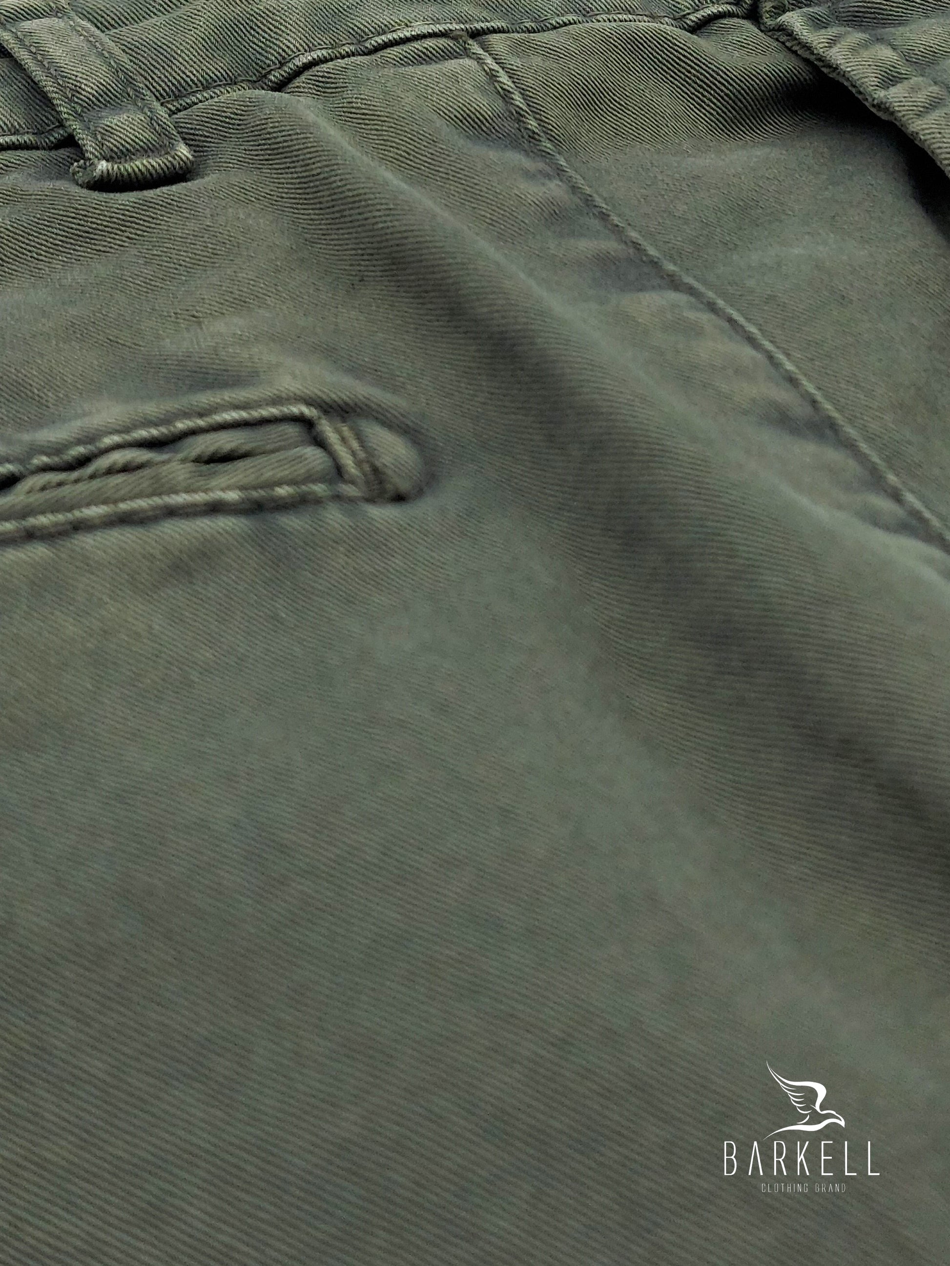 Pantalone di Alta Qualità Modello Chinos con Tasca America e Chiusura a Zip color Verde Militare realizzato in 98% Puro Cotone Gabardina Lavaggio Ice Vintage e 2% Elastan.