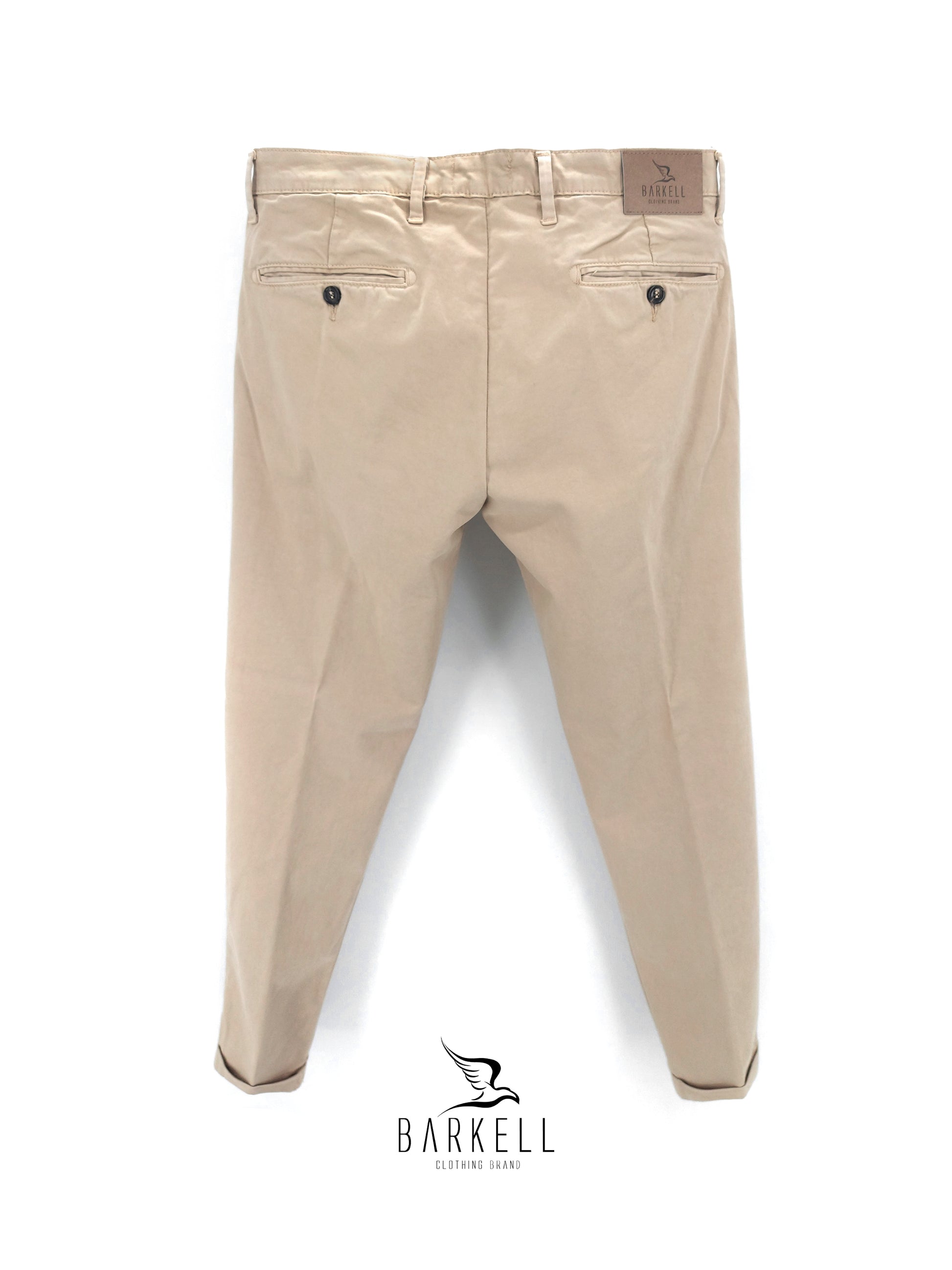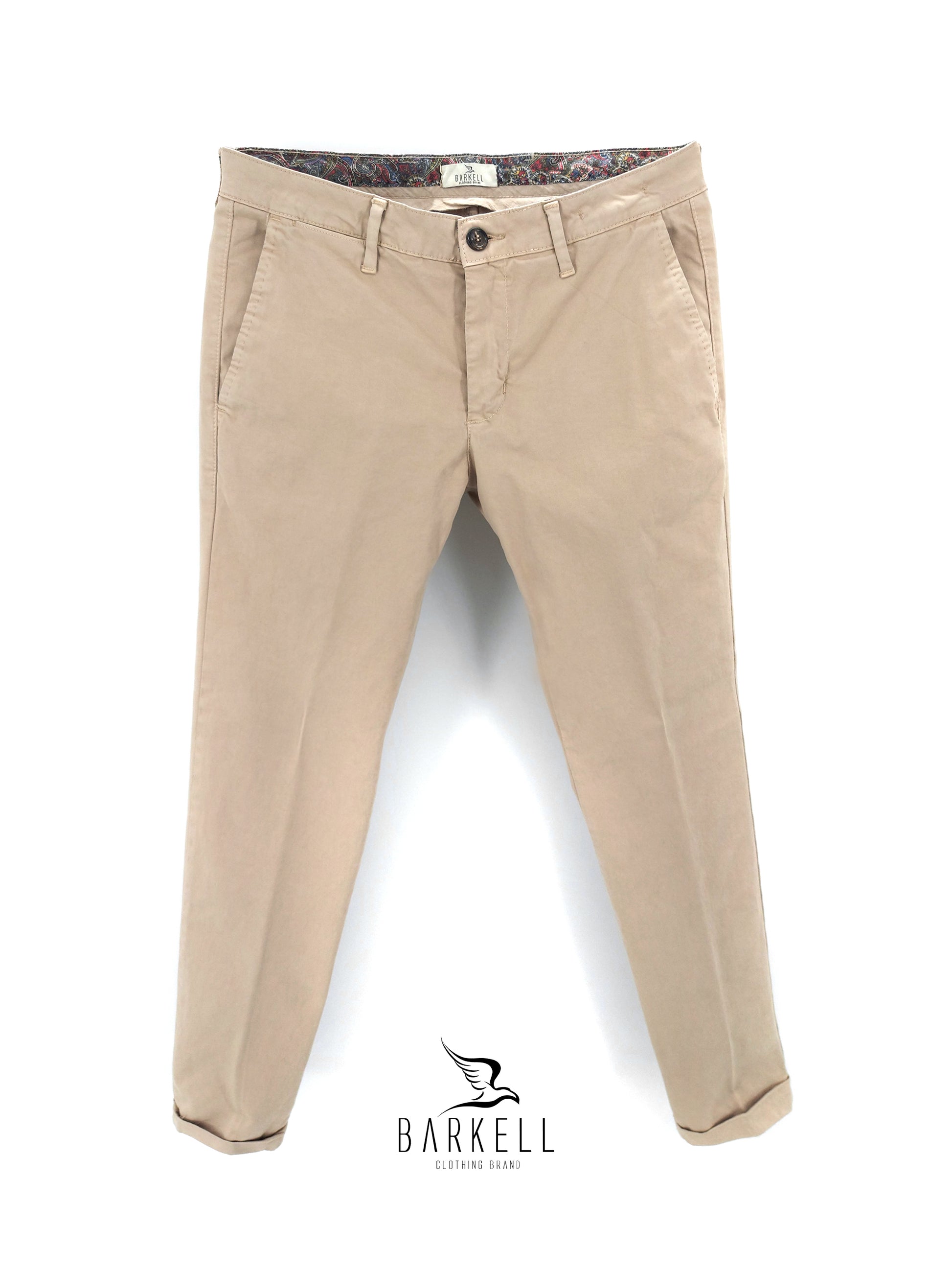 Pantalone di Alta Qualità Modello Chinos con Tasca America e Chiusura a Zip con Risvolto sul Fondo color Beige realizzato in 98% Puro Cotone Raso e 2% Elastan.