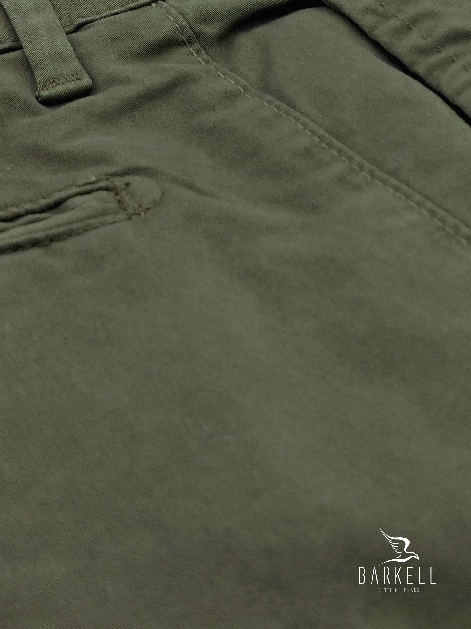 Pantalone di Alta Qualità Modello Chinos con Tasca America e Chiusura a Zip con Risvolto sul Fondo color Verde Militare realizzato in 98% Puro Cotone Raso e 2% Elastan.