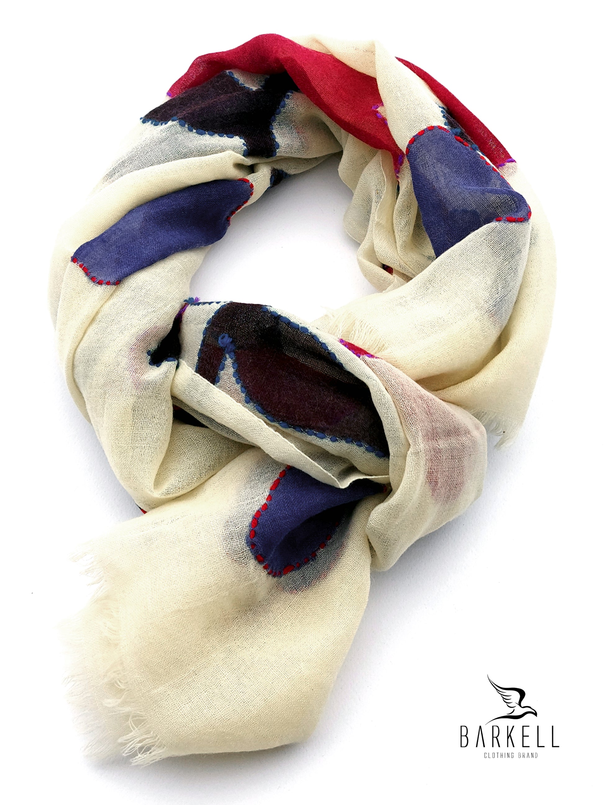 Sciarpa in Pura Lana di Alta Qualità Fantasia Floreale Ricamata Fondo Panna
