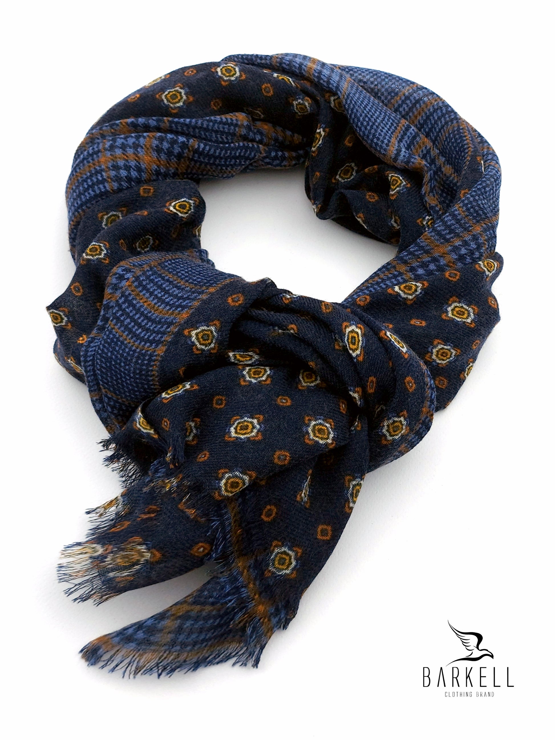 Sciarpa di Alta Qualità Made in Italy in 100% Pura Lana Rasata fantasia Multicolore fondo Blu.