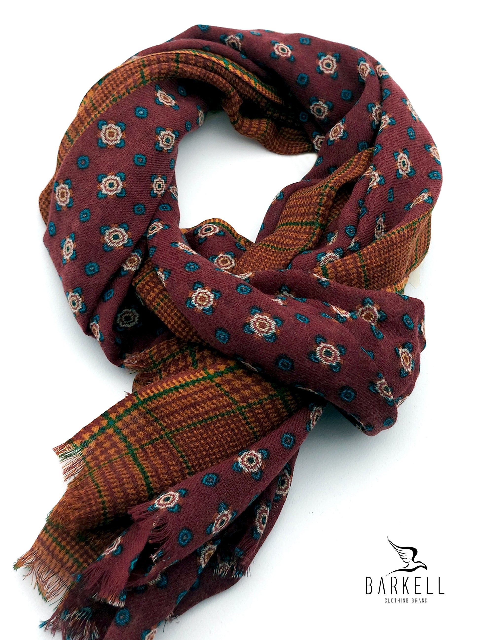 Sciarpa di Alta Qualità Made in Italy in 100% Pura Lana Rasata fantasia Multicolore fondo Bordò.