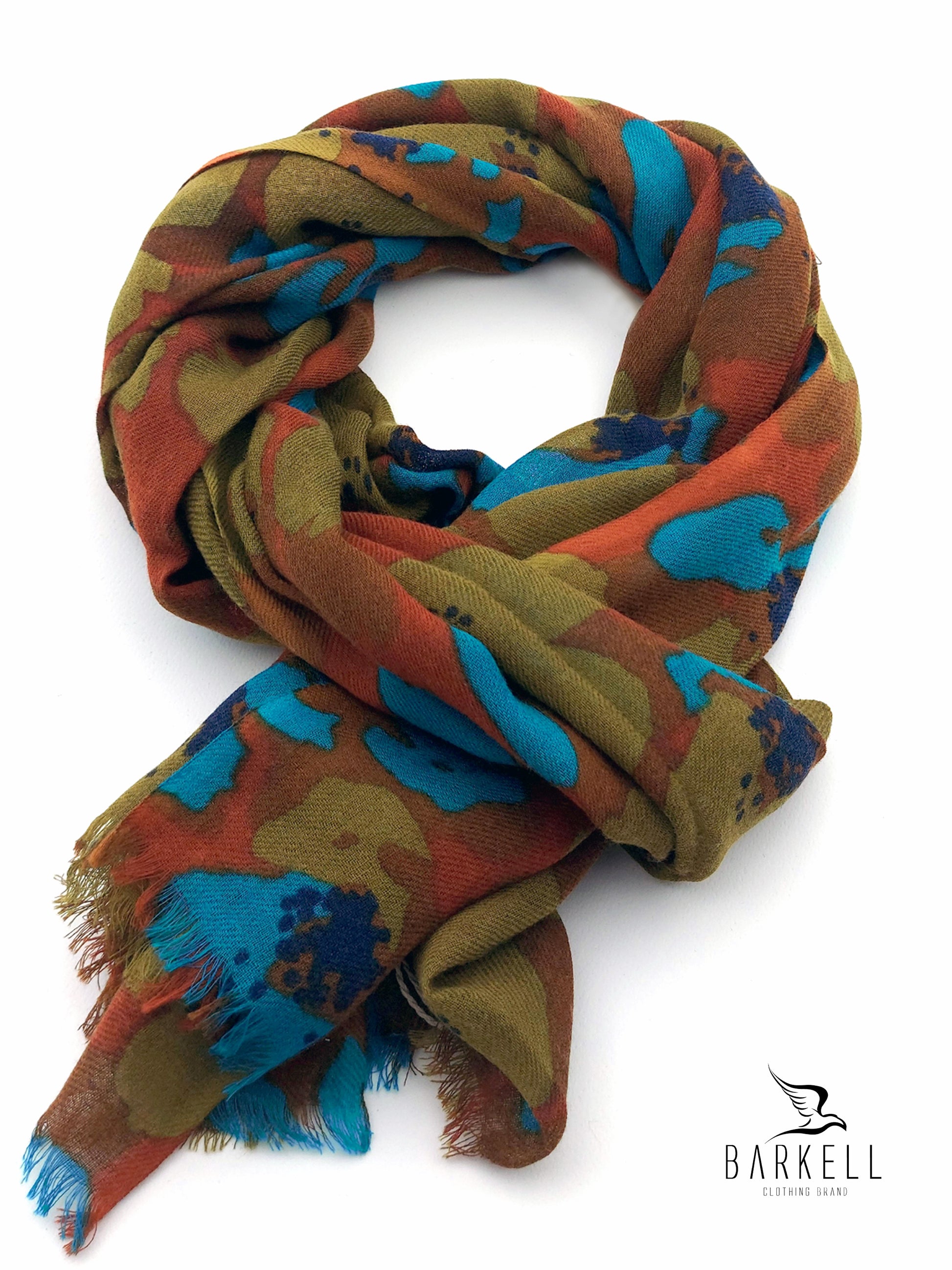 Sciarpa di Alta Qualità Made in Italy in 100% Pura Lana Rasata fantasia Multicolore fondo Cammello.