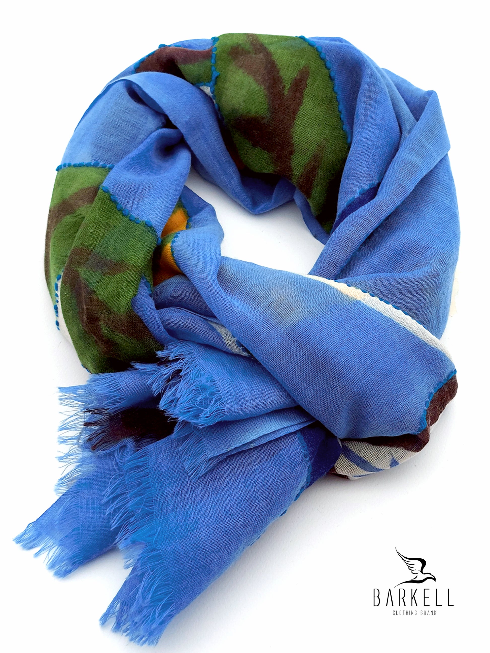 Sciarpa in Pura Lana di Alta Qualità Fantasia Ricamata Multicolore Fondo Azzurro