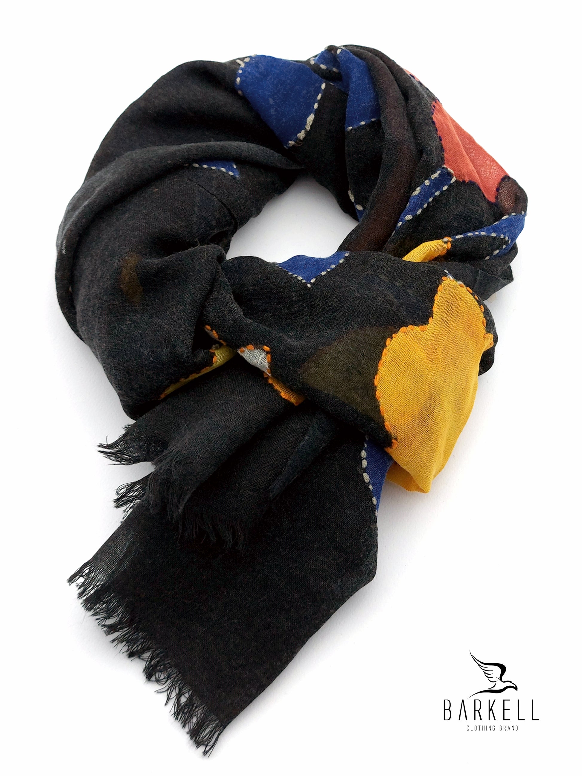 Sciarpa in Pura Lana di Alta Qualità Fantasia Ricamata Multicolore Fondo Nero